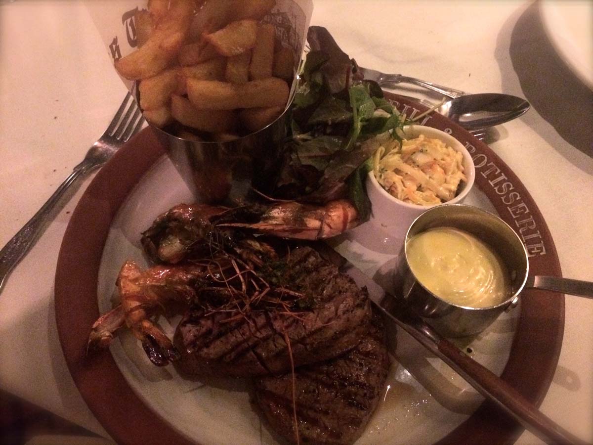 The lamb was simply outstandingly flavoursome and the dish itself was beautifully balanced. This was classic cooking. Clearly the chef allows the quality of the produce to do the talking. For my dining partner the surf and turf was a temptation not to be resisted: the steak was as soft as you like, the addition of tiger prawns took the dish to a whole new level. Simply a very special surf and turf.