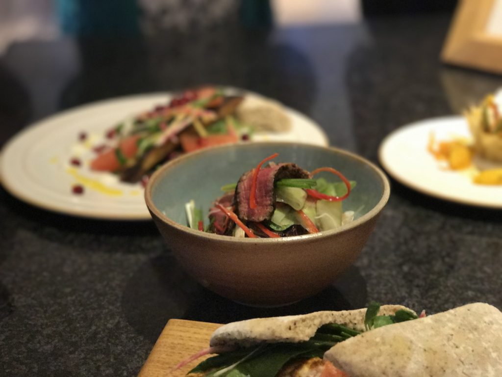 Pan Fried Aromatic Beef Fillet with Cucumber Ribbons, Sweet Pickled Radish, and Chili & Mint Vermicelli.