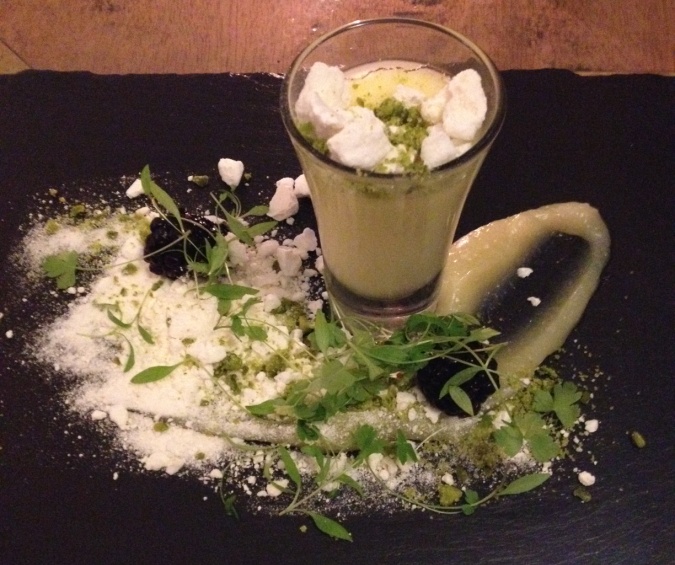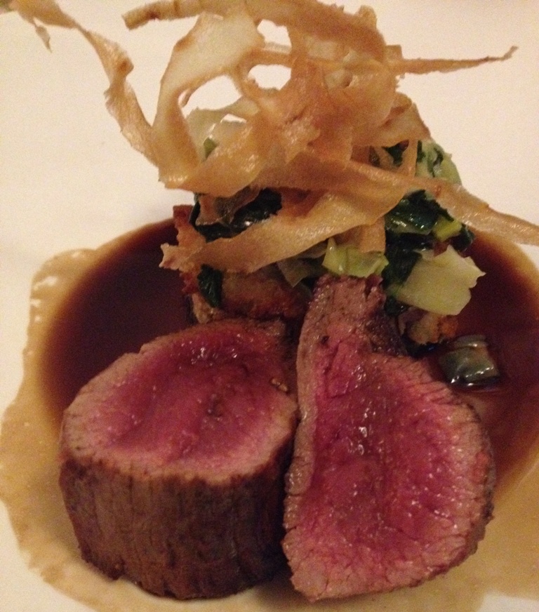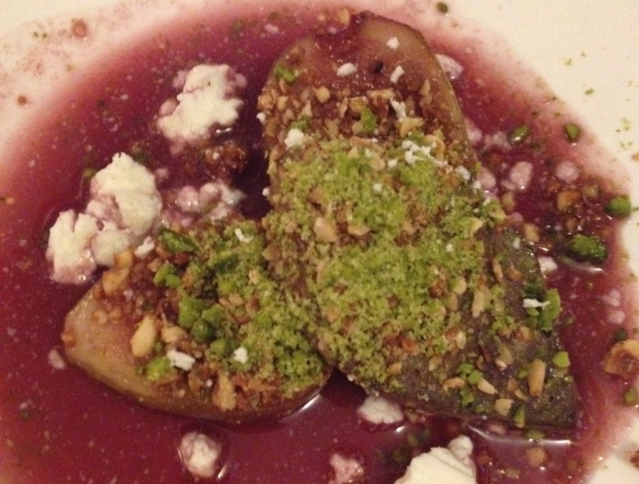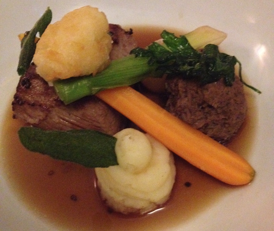 Kicking off with an Amuse Bouche of pumpkin soup, we were off on our multi-course delight. This was followed by Breast of Pigeon, Poached Figs, Goats Cheese, Pistachio and Oat Crumb. While pigeon wouldn’t ever be my first choice, I am always happy to be put out of my comfort zone and be coaxed into trying even my last choice. It was delectable and the best I can describe this wonderfully-cooked bird was a cross between beef (but lighter in taste) and pate (but tougher).
