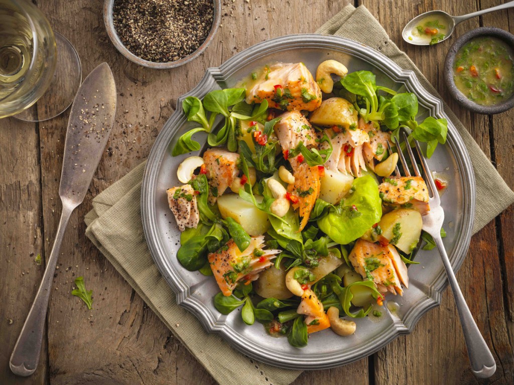 - Make a dressing by whisking together the oil, ginger, chilli, lemongrass paste, coriander, honey and lemon juice. Break up the salmon fillets into bite-sized chunks and arrange on two plates with the salad leaves and new potatoes. Scatter over the nuts and spoon over the dressing.